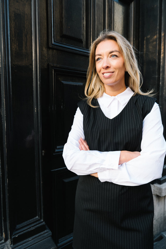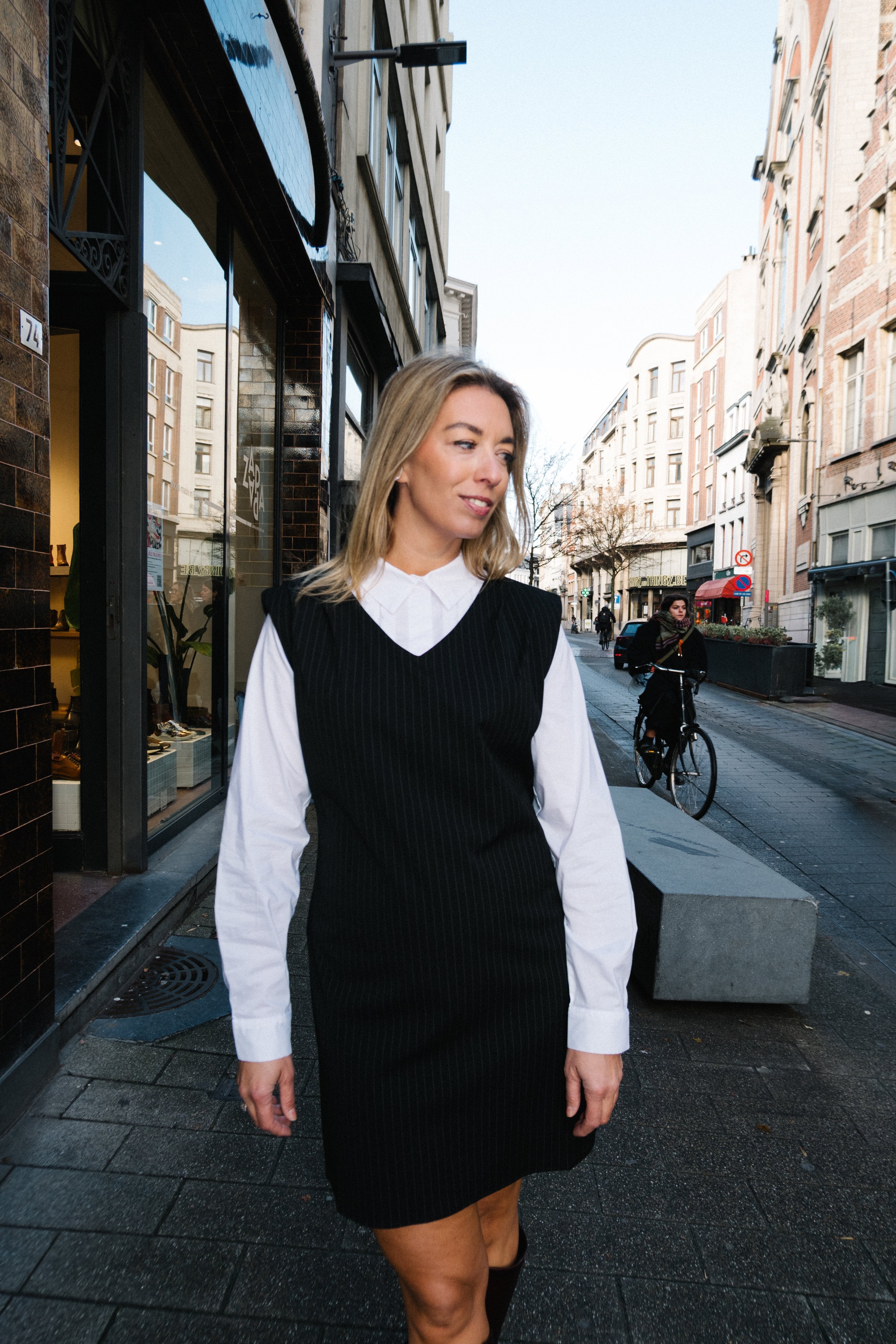 • Tailoring Spencer is an elegant black pinstripe dress with a simple and classic cut. The design is sleeveless with a subtle V-neckline that gives a sophisticated look, while the slightly A-line silhouette creates a flattering fit.