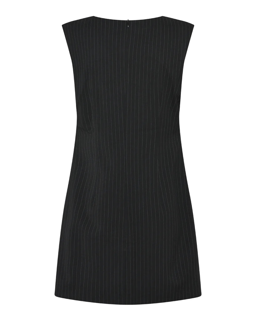 - Tailoring Spencer is an elegant black pinstripe dress with a simple and classic cut. The design is sleeveless with a subtle V-neckline that gives a sophisticated look, while the slightly A-line silhouette creates a flattering fit.