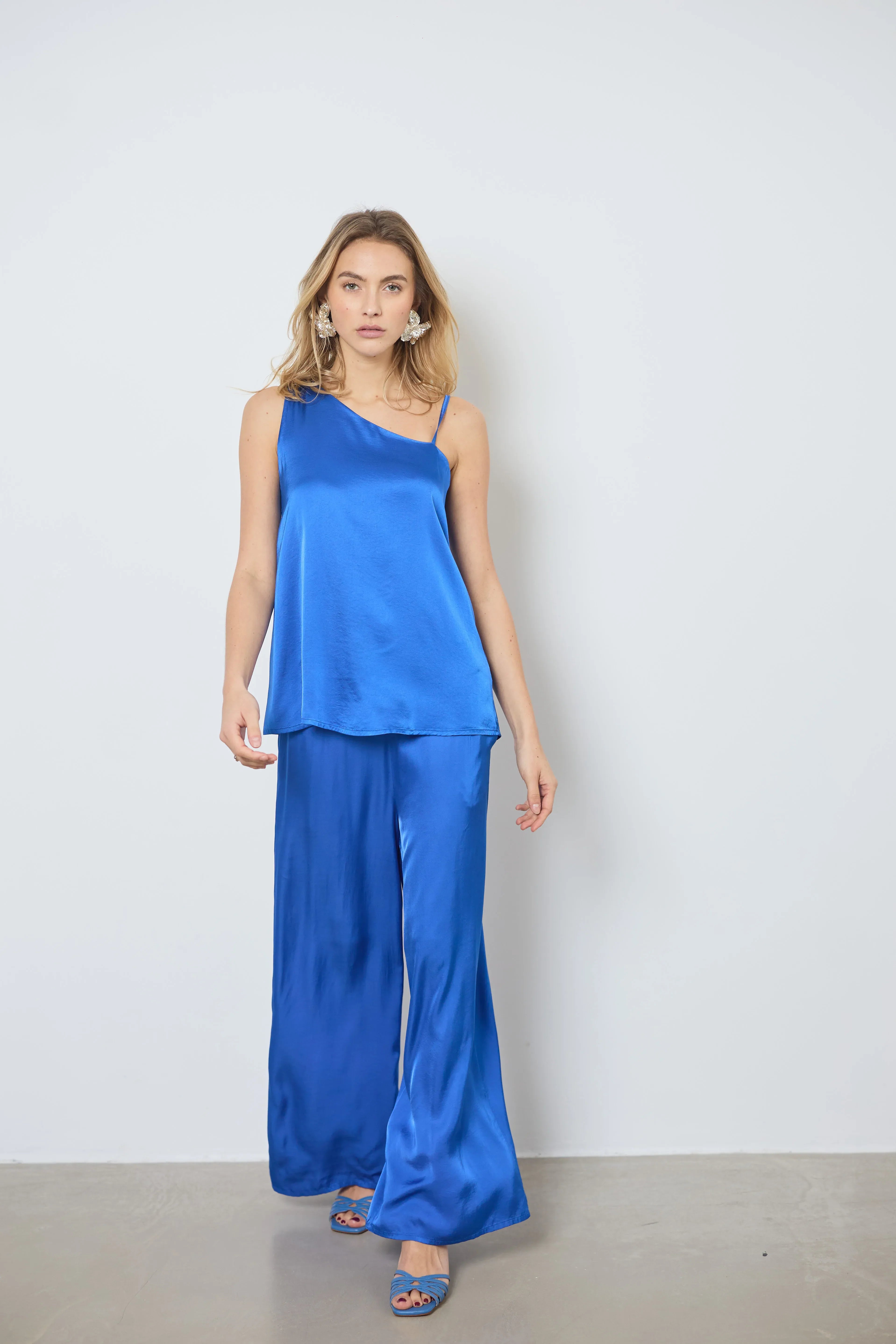Add a touch of sophistication to your outfit with this asymmetrical satin top. One wide strap and one thin strap create a chic effect, perfect for elegant evenings.