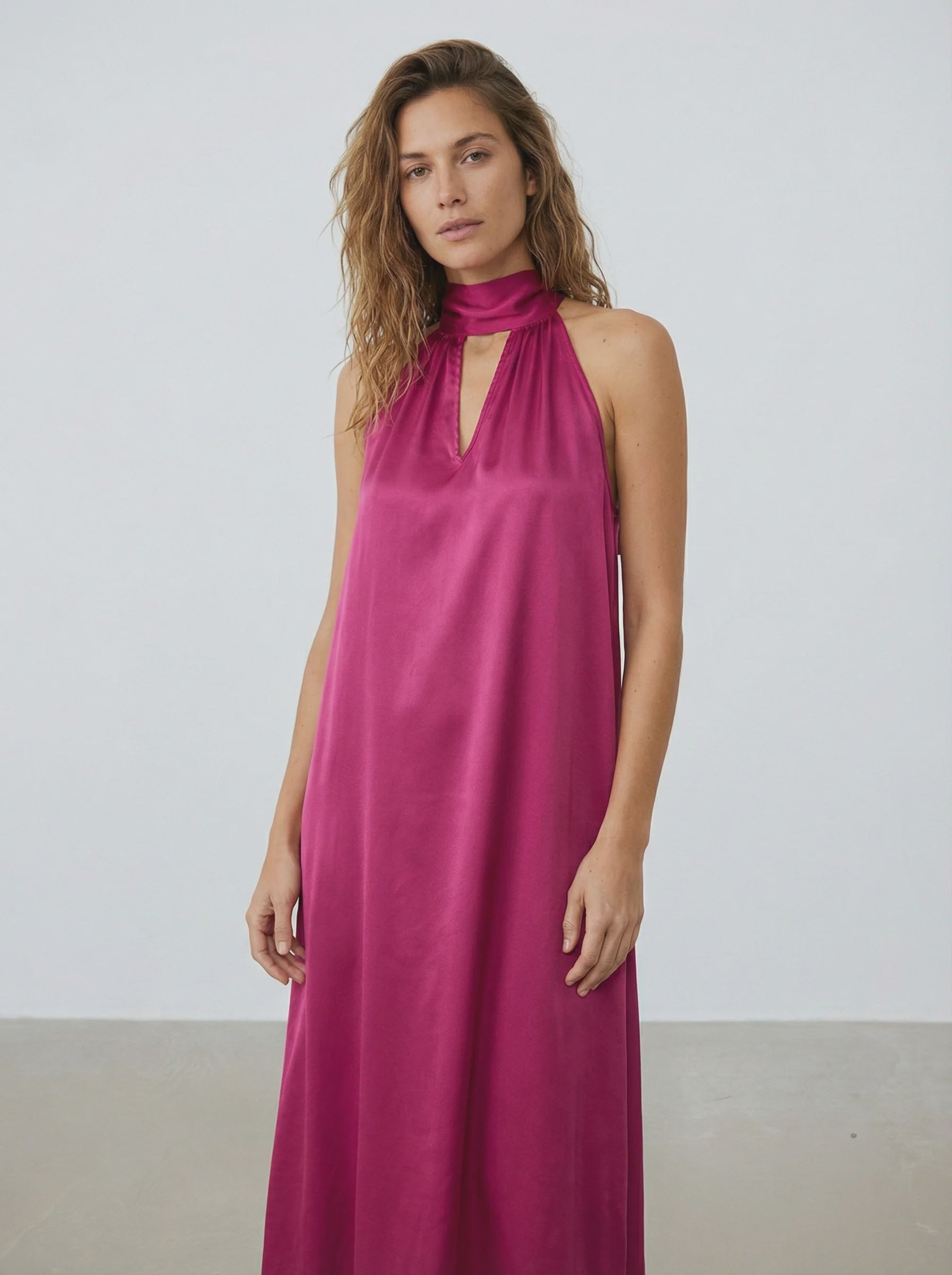 Bring elegance and lightness with the Victoria dress, derived from our best-selling style. Long, sleeveless satin dress with a tie back and a V-shaped front opening for a refined look.