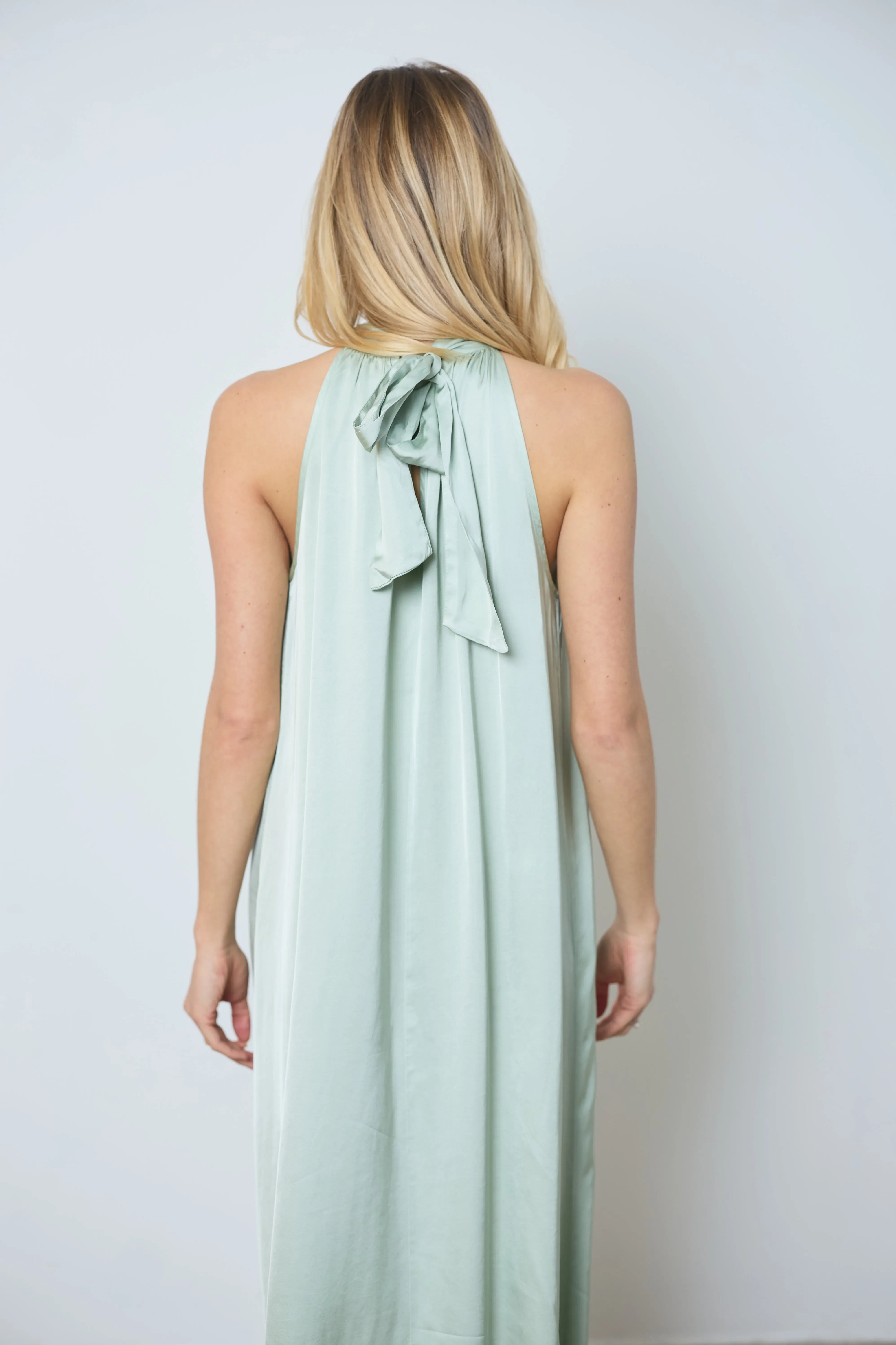 Bring elegance and lightness with the Victoria dress, derived from our best-selling style. Long, sleeveless satin dress with a tie back and a V-shaped front opening for a refined look.