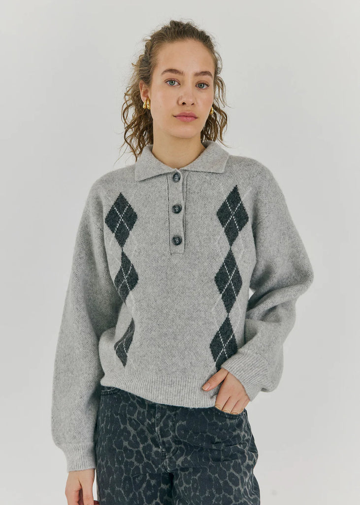 - Classic knit with a modern twist, featuring argyle details and a polo collar.