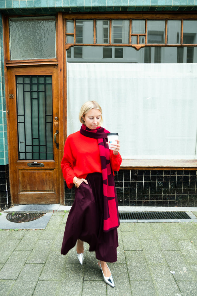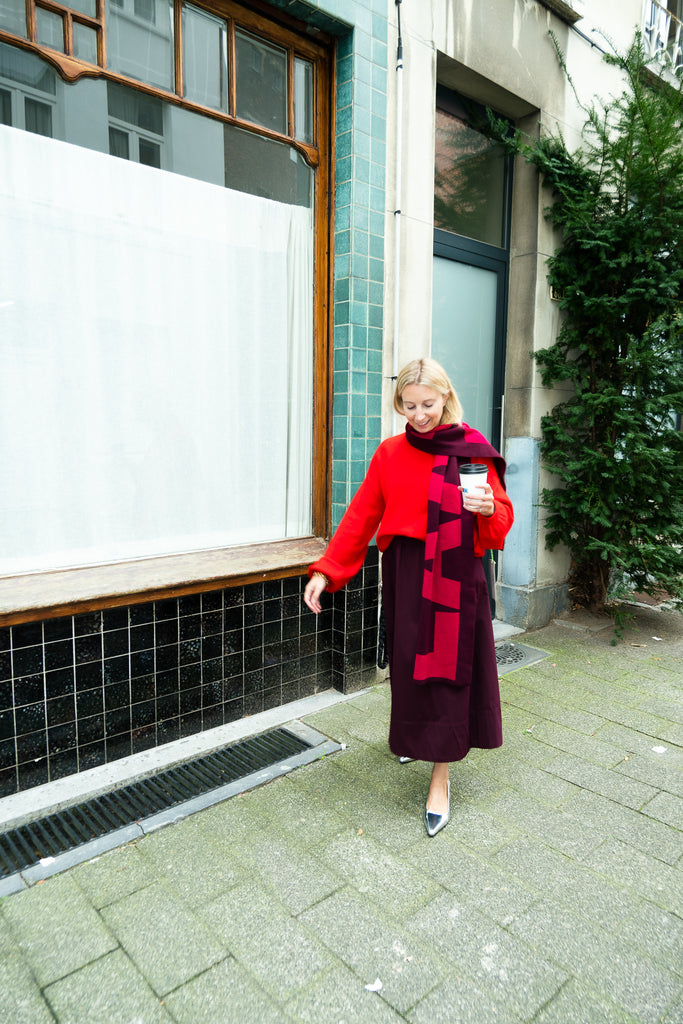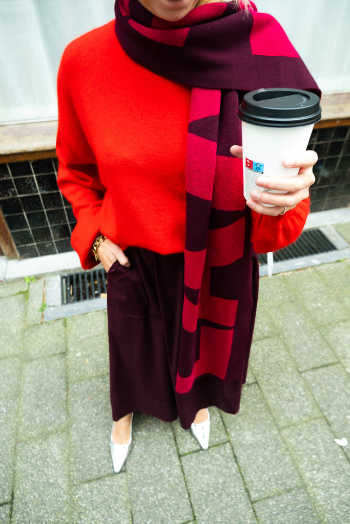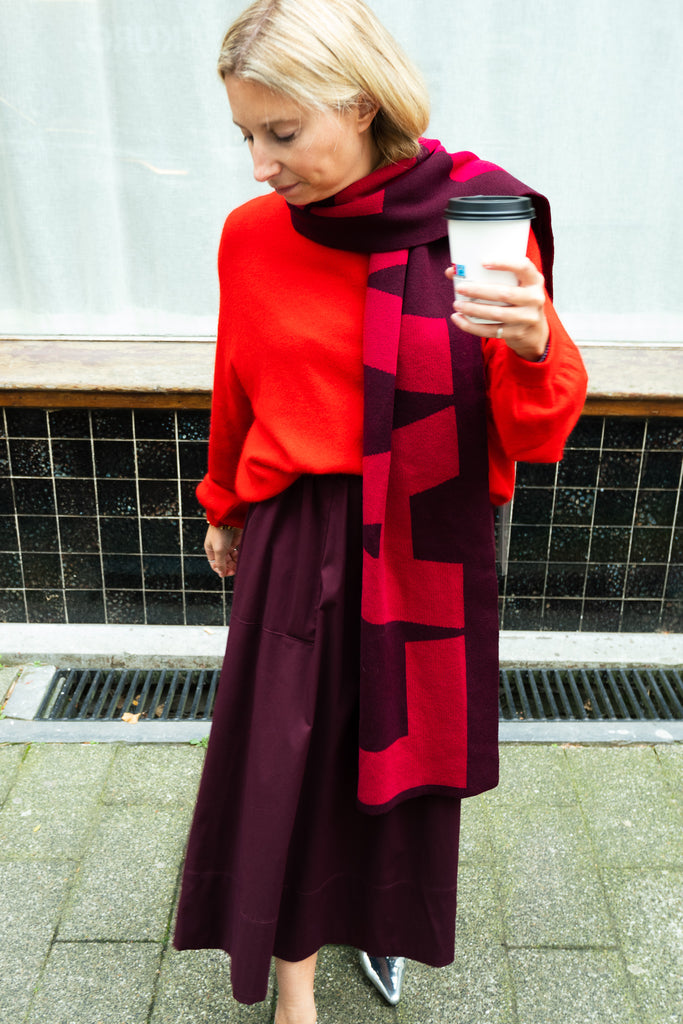 - Plum knit logo scarf made from a blend of recycled cotton Featuring a red LAAGAM logo in jacquard.