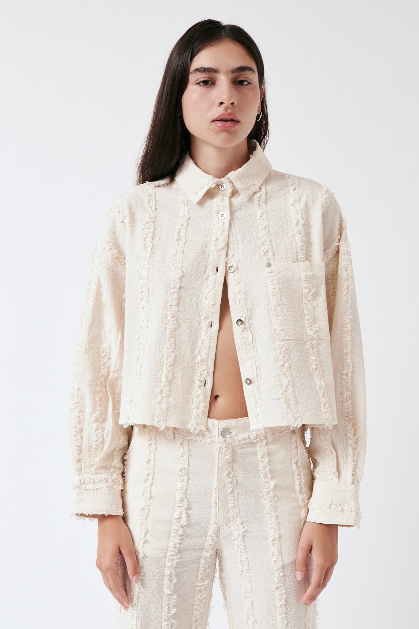 - This cropped shirt in 100% organic cotton reinvents a wardrobe classic with a fresh, modern twist. Designed with long sleeves and a flattering cropped cut, it’s versatile and unique — perfect for layering or styling on its own.