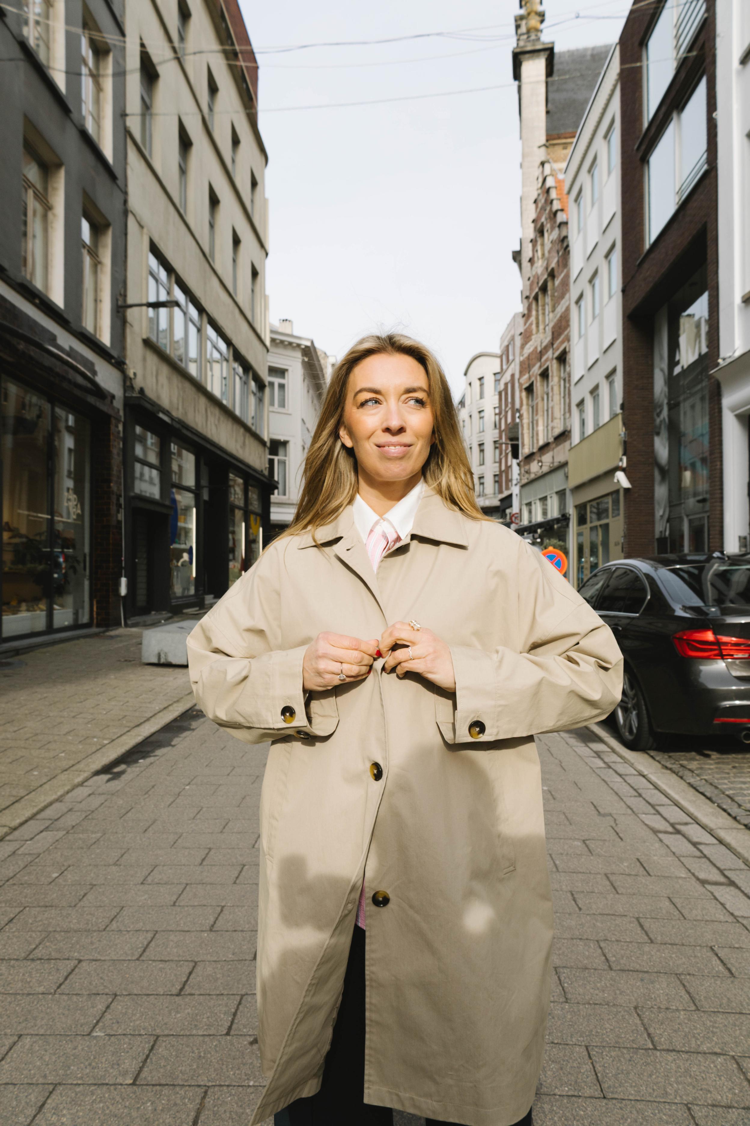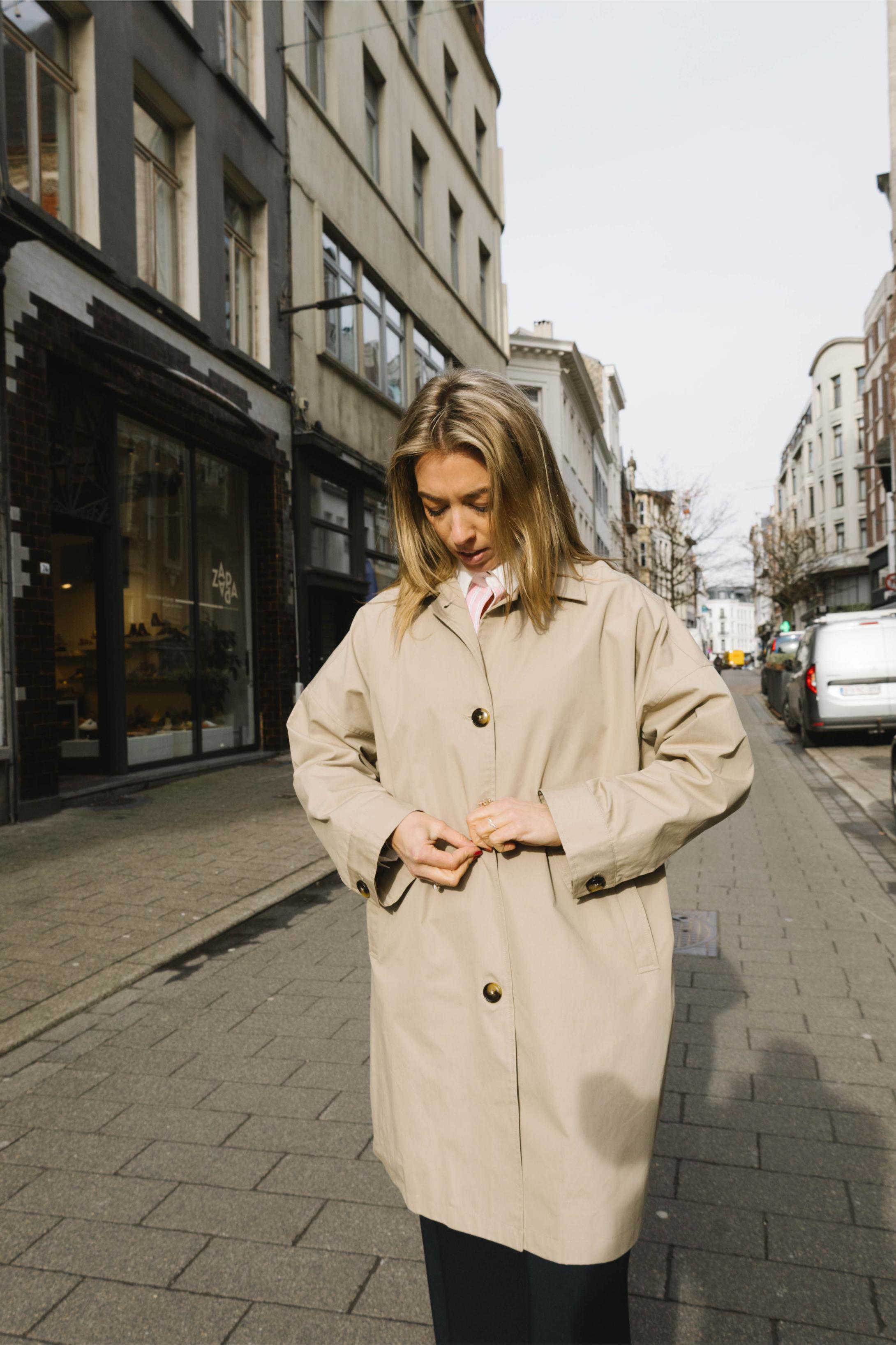 - The trenchcoat is simple in its design with side pockets, a collar, a back slit as well as horn buttons on the front and on the long sleeves.